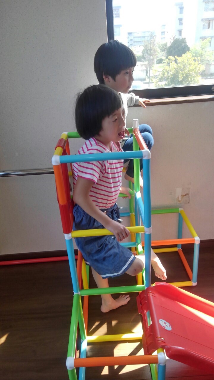 マミー本部では、遊具やバランスボールで体を動かして遊ぶ子。