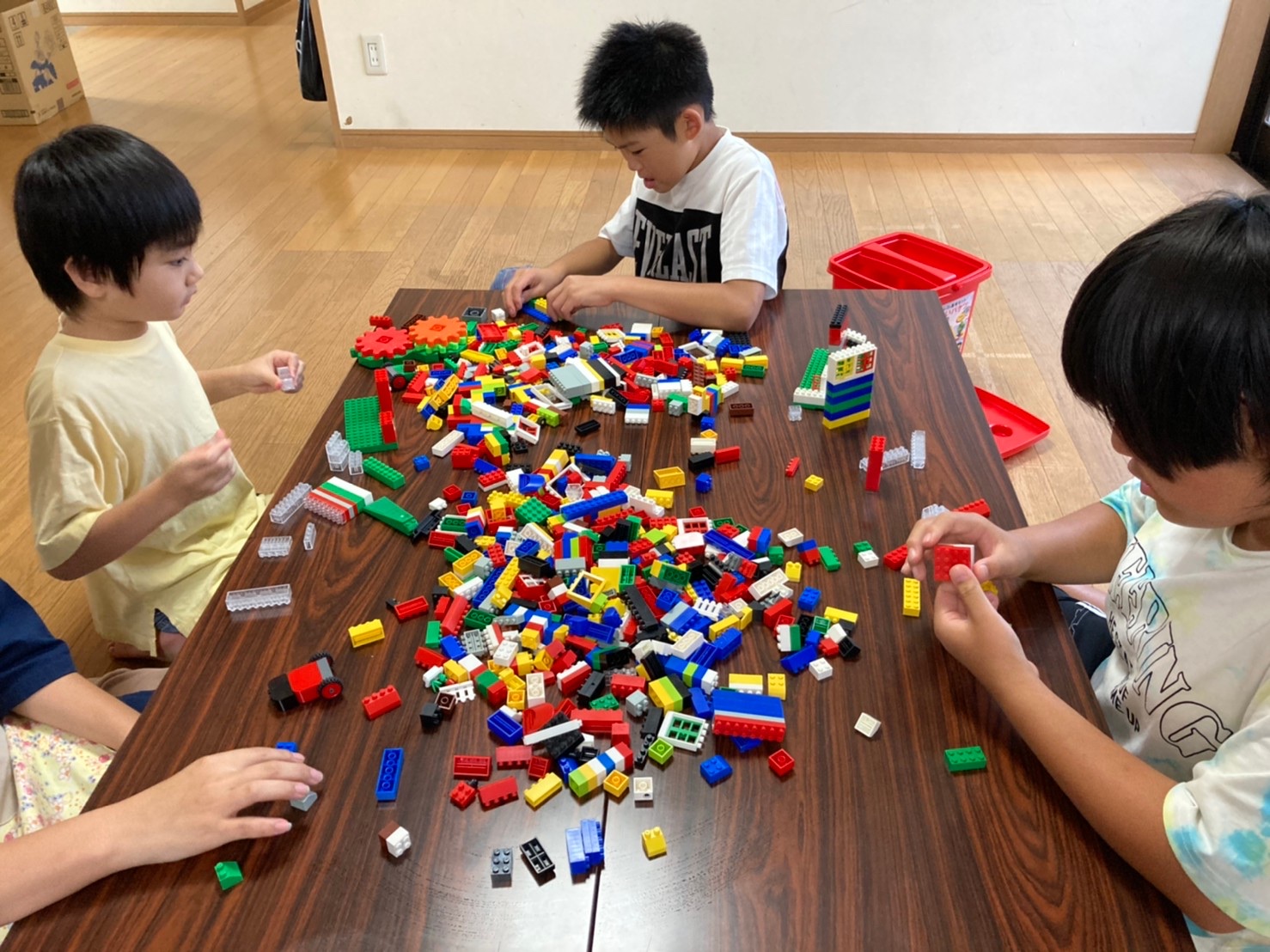 おやつの後、ミニサイズのレゴブロックをテーブルに出して、皆で作品作り♪それぞれが自由にブロックを組み合わせて好きなものを作っていました♪カメラを作る子供。家を作る子供。想像を膨らませて、個性的な作品がたくさん出来ていました♪大人が作ると、きっと決まりきった形になってしまいそうですが、子供たちの手にかかると配色も綺麗で、大人たちは皆感動です(^^♪子供たちにしか作れないレゴの世界を、今日はたくさん見せてもらいました♪
